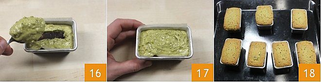 und bedecken Sie alles bis zum Rand mit weiterem Pistazienteig (16-17). Backen Sie im vorgeheizten statischen Ofen 35 Minuten bei 170° (oder 25 Minuten im Umluftofen bei 150°), bis die Oberfläche der Pfundkuchen leicht zu bräunen beginnt 18. Nehmen Sie die Mini-Pfundkuchen mit Pistazien und Nesquik-Kern aus dem Ofen, lassen Sie sie abkühlen und genießen Sie sie!