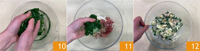 Den Mangold gut abtropfen und ausdrücken 10, dann in die Schüssel geben 11. Mischen Sie, um die Zutaten zu kombinieren 12.