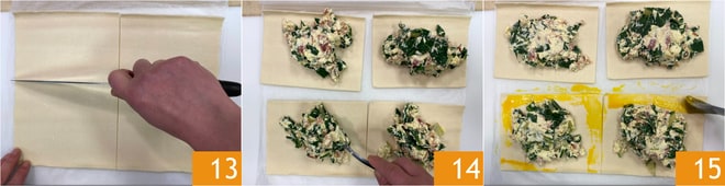 Schneiden Sie den Blätterteig in 4 Rechtecke von etwa 10x15 cm 13. Geben Sie etwas Füllung in die Mitte der Rechtecke 14 und bestreichen Sie die Ränder mit einem verquirlten Eigelb 15.