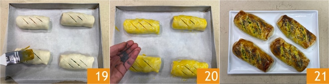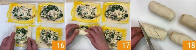 Falten Sie die kurzen Seiten nach innen 16, dann rollen Sie die Strudel auf 17, dabei darauf achten, die Enden gut zu verschließen. Schneiden Sie die Oberfläche der Röllchen ein 18.