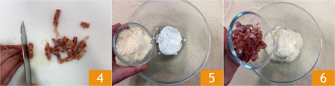 Schneiden Sie den Speck in Streifen 4. Geben Sie die Ricotta in eine Schüssel, fügen Sie dann den Parmesankäse 5 und den Speck 6 hinzu.