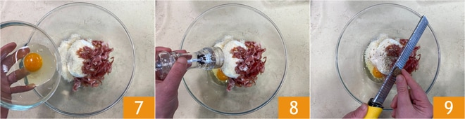 Fügen Sie das Ei hinzu 7 und würzen Sie mit Salz, Pfeffer 8 und einer Prise Muskatnuss 9.