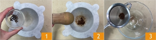 Um die Mini-Tarte-Tatin mit kleinen Zwiebeln zuzubereiten, geben Sie zuerst die Nelken in einen Mörser 1 und zerstoßen Sie sie mit einem Stößel, bis sie zu Pulver werden 2. Sieben Sie das entstandene Pulver und stellen Sie es beiseite 3.