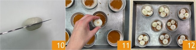 Schneiden Sie nun die kleinen Zwiebeln horizontal in der Mitte durch 10 und legen Sie sie auf das Karamell, wobei die Schnittseite nach unten zeigt 11. Verwenden Sie je 3 Stück pro Förmchen 12.