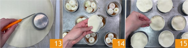 Rollen Sie nun den Blätterteig aus und schneiden Sie Scheiben in der gleichen Größe wie die Basis der Förmchen 13. Legen Sie die Blätterteigscheibe über die kleinen Zwiebeln 14 und schlagen Sie die Ränder um, um die Seiten zu versiegeln 15.