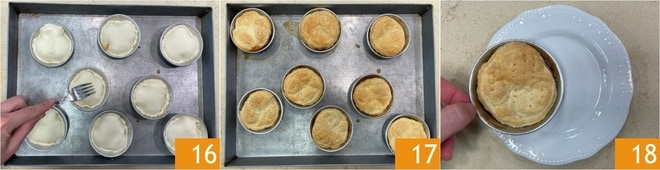 Stechen Sie den Blätterteig mit einer Gabel ein 16 und backen Sie ihn im vorgeheizten statischen Ofen bei 180° für etwa 30 Minuten. Sobald die Oberfläche goldbraun ist, nehmen Sie die Mini-Tarte-Tatin aus dem Ofen und lassen Sie sie abkühlen 17, dann drehen Sie sie vorsichtig auf einen Teller 18.