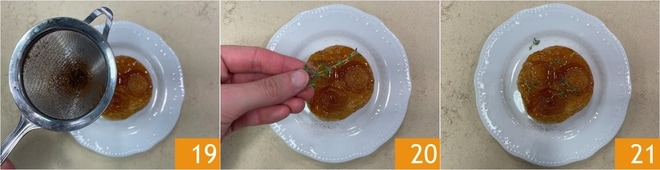 Garnieren Sie mit dem beiseitegestellten Nelkenpulver 19 und ein paar frischen Thymianblättern 20. Ihre Mini-Tarte-Tatin mit kleinen Zwiebeln sind bereit zum Servieren 21!