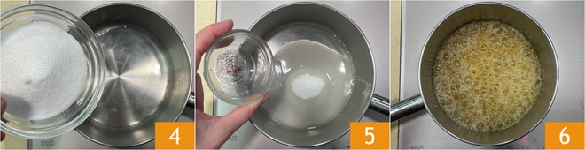 Beginnen Sie mit der Zubereitung des Karamells: Geben Sie Wasser, Zucker 4 und das Nelkenpulver in einen kleinen Topf, wobei Sie einen kleinen Teil zur Garnierung aufbewahren 5. Bringen Sie es bei mittlerer Hitze zum Kochen 6.