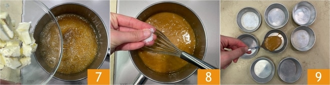Wenn das Karamell 180° erreicht hat und eine bernsteinfarbene Färbung annimmt, schalten Sie die Hitze aus und fügen Sie die in Würfel geschnittene Butter hinzu 7. Rühren Sie gut mit einem Schneebesen, dann geben Sie das Salz hinzu 8 und mischen Sie erneut. Gießen Sie das noch heiße Karamell auf den Boden von 8 Aluminiumförmchen mit einem Durchmesser von 8 cm 9 und stellen Sie sie dann auf ein Backblech.