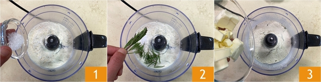 Zur Zubereitung der Mini-Tarts mit Kartoffeln, Brokkoli und Sardellen beginnen Sie mit dem Boden aus herzhaftem Mürbeteig: Geben Sie das Mehl, das grobe Salz 1 und einige frische Rosmarinnadeln 2 in die Schüssel des Mixers. Fügen Sie nun die kalten Butterwürfel direkt aus dem Kühlschrank hinzu 3.