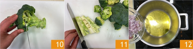 Kümmern Sie sich nun um den Brokkoli: Trennen Sie die Röschen 10 und teilen Sie mit einem scharfen Messer den Stängel in zwei Hälften und schneiden ihn in kleinere Stücke, wobei Sie die härteren Teile entfernen 11. Erhitzen Sie in einem großen Topf etwas Olivenöl extra vergine, fügen Sie dann die gehackte Schalotte hinzu 12 und lassen Sie sie etwa 7-8 Minuten sanft schmoren, gelegentlich umrühren, bis sie weich und glasig ist.