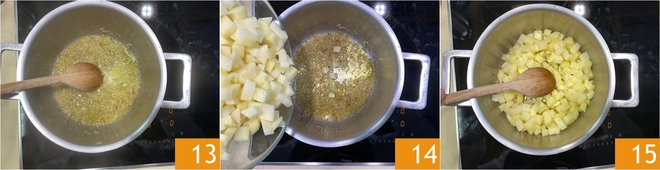 Wenn die Schalotte fertig ist 13, fügen Sie die Kartoffeln hinzu 14, rühren gut um und lassen sie bei mittlerer Hitze einige Minuten anbraten 15.