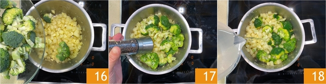 Fügen Sie nun auch den Brokkoli hinzu, sowohl die Röschen als auch den Stiel 16, würzen Sie nach Belieben mit Salz und Pfeffer 17 und gießen Sie heißes Wasser darüber, bis das Gemüse bedeckt ist 18. Kochen Sie mit Deckel etwa 30 Minuten, bis alle Zutaten gut weich sind.