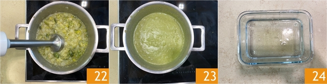 Wenn das Gemüse fertig ist, pürieren Sie alles mit einem Stabmixer 22, bis Sie eine glatte, samtige Creme in leuchtendem Grün erhalten 23. Weichen Sie die Gelatineblätter für einige Minuten in kaltem Wasser ein 24.