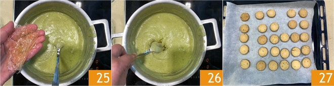 Dann drücken Sie sie gut aus 25 und geben sie zur noch warmen Creme hinzu, wobei Sie sorgfältig umrühren, bis sie sich vollständig aufgelöst hat 26. Mischen Sie, bis Sie eine homogene und glänzende Konsistenz erhalten, lassen Sie sie abkühlen und stellen Sie die Creme in den Kühlschrank, um sie fest werden zu lassen. Sobald die Böden gebacken sind, nehmen Sie sie heraus und lassen sie vollständig abkühlen 27.