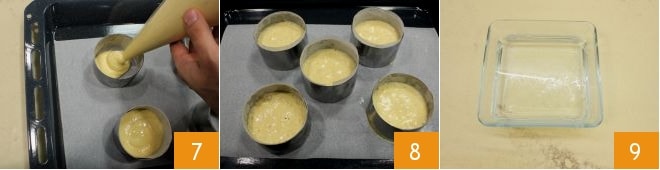 Legen Sie dann auf ein mit Backpapier ausgelegtes Backblech 5 Stahlringe mit einem Durchmesser von 7,5 cm und einer Höhe von 4,5 cm. Füttern Sie jeden Ring mit einem ca. 5 cm hohen Streifen Backpapier aus. Füllen Sie dann jeden Ring zu etwa ¾ mit der aufgeschlagenen Masse (7-8). Backen Sie die Biskuits im vorgeheizten statischen Ofen bei 175° für 35 Minuten (bei Umluftofen bei 155° für ca. 25 Minuten, überprüfen Sie mit einem Zahnstocher, ob das Innere trocken ist, bevor Sie sie herausnehmen). Wenn sie fertig sind, nehmen Sie sie aus dem Ofen und lassen Sie sie abkühlen. Inzwischen bereiten Sie die Glasur vor: Weichen Sie die Gelatineblätter mindestens 10 Minuten in kaltem Wasser ein 9.