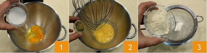 Um die weiße Mini-Sacher mit Mandeln zuzubereiten, beginnen Sie mit dem Biskuitteig: In die Schüssel einer Küchenmaschine mit Rührbesen (Sie können auch einen elektrischen Mixer verwenden) geben Sie die Eier und den Zucker 1, fügen Sie auch den Honig hinzu 2 und beginnen Sie alles zu verarbeiten, um eine helle und schaumige Masse zu erhalten. Sieben Sie das Mehl 3