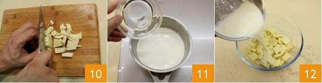 Hacke die Schokolade grob 10 und gib sie in eine Schüssel, dann gib die Sahne in einen Topf und füge den Glukosesirup hinzu 11, rühre und bringe sie kurz vor dem Siedepunkt. Gieße die Sahne über die weiße Schokolade 12 und rühre, um sie zu schmelzen, füge dann die gut ausgedrückten Gelatineblätter hinzu und rühre, um sie vollständig aufzulösen.