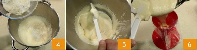 dann geben Sie es in die Küchenmaschine 4 und mischen Sie mit einem Spatel mit einer Bewegung von unten nach oben 5. Wenn es gut vermischt ist, geben Sie die Masse in einen Spritzbeutel 6.