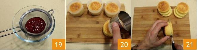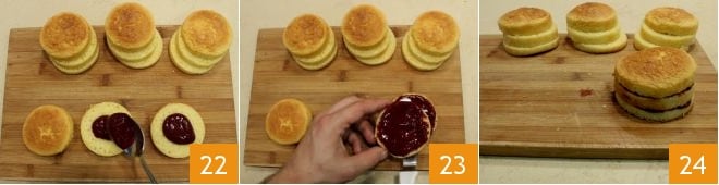 Fülle die untere Scheibe mit einem Löffel Konfitüre 22, fahre mit einer weiteren Biskuitscheibe fort und fülle sie 23; lege dann eine weitere Scheibe darauf, um die Törtchen zu vervollständigen 24.