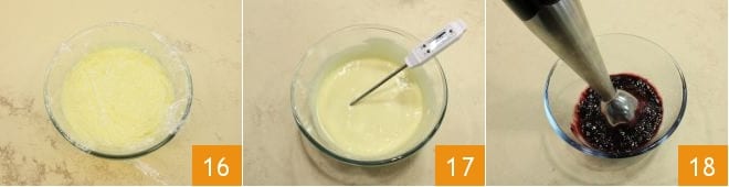 Decke sie mit Frischhaltefolie ab und stelle sie beiseite 16: Für eine perfekte Konsistenz miss die Temperatur der Glasur mit einem Lebensmittelthermometer 17: Sie sollte 30-32° erreichen; wenn sie zu kalt wird, reicht es, sie ein paar Sekunden in der Mikrowelle zu erwärmen. Mixe die Beerenkonfitüre mit einem Stabmixer 18
