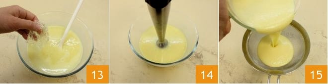 Füge dann die gut ausgedrückten Gelatineblätter hinzu 13 (du kannst auch so vorgehen: 2 Esslöffel der erhitzten Sahne beiseitestellen und die Gelatine zuerst in der heißen Sahne auflösen und dann zum Rest der Glasur hinzufügen); rühre, um sie vollständig aufzulösen. Mixe mit einem Stabmixer für ein paar Sekunden 14 und passe die Creme gegebenenfalls durch ein Sieb, um Klumpen zu entfernen 15.