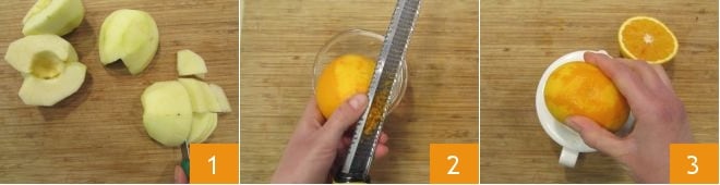 Um die Mini-Plumcakes ohne Zucker zuzubereiten, waschen Sie zuerst die Äpfel, dann legen Sie eine Hälfte beiseite und decken diese für die endgültige Dekoration mit Frischhaltefolie ab. Schälen und schneiden Sie die restlichen Äpfel in etwa 3 mm dicke Scheiben 1 und legen Sie sie in eine große Schüssel. Reiben Sie die Schale einer unbehandelten Orange ab und legen Sie sie beiseite 2; dann pressen Sie den Saft dieser abgeriebenen Orange und einer weiteren 3.