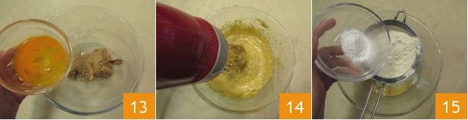 Geben Sie die entstandene Creme in eine Schüssel, fügen Sie das Ei hinzu 13, eine Prise Salz und mischen Sie mit einem elektrischen Handrührgerät 14. Sieben Sie das Mehl und das Backpulver in die Schüssel 15