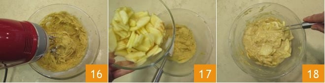 und arbeiten Sie die Mischung weiter mit dem elektrischen Handrührgerät, um alles zu kombinieren 16. An diesem Punkt fügen Sie die mit Orangensaft gewürzten Apfelscheiben hinzu 17 und mischen Sie sie mit einem Spatel in den Teig 18.