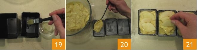 Ölen 19 und mehlen Sie 6 Mini-Plumcake-Formen von 7x4 cm mit 4,5 cm Höhe, dann füllen Sie sie mit der Mischung bis 1 cm unter den Rand 20. Garnieren Sie die Oberfläche mit der zurückbehaltenen Apfelhälfte, die Sie geschält und in Scheiben geschnitten haben 21, und backen Sie sie in einem vorgeheizten statischen Ofen bei 180° für etwa 25 Minuten.