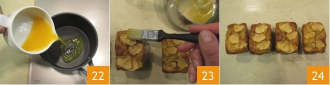 In der Zwischenzeit geben Sie den beiseitegelegten Orangensaft in einen kleinen Topf 22 und lassen ihn bei mittlerer Hitze für 2-3 Minuten reduzieren 22. Sobald die Mini-Plumcakes gebacken sind, nehmen Sie sie aus dem Ofen und lassen Sie sie abkühlen, dann entfernen Sie sie aus der Form und bestreichen sie mit der Orangensaftreduktion 23. Ihre zuckerfreien Mini-Plumcakes sind bereit zum Genießen 24!