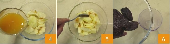 Von dem gepressten Orangensaft verwenden Sie 100 g für die Zubereitung des Teigs, indem Sie ihn zu den Apfelscheiben in die Schüssel geben 4, den restlichen Saft beiseitelegen: Er wird benötigt, um die Plumcakes nach dem Backen zu bestreichen. Mischen Sie die Äpfel gut mit dem Orangensaft 5 und legen Sie sie beiseite. Geben Sie die entkernten Datteln in einen hohen, schmalen Behälter 6,