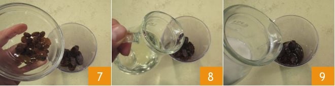 fügen Sie die zuvor gewaschene Rosinen hinzu 7, das Pflanzenöl 8, die Milch 9