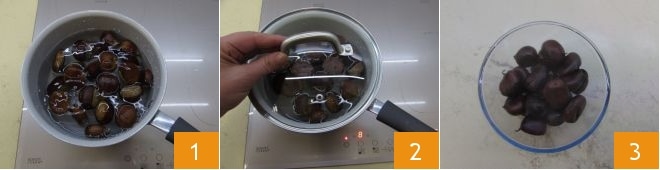 Um das Perlhuhn gefüllt mit Kastanien und Granatapfelsauce zuzubereiten, beginnen Sie mit dem Kochen der Kastanien. Geben Sie sie in einen Topf mit Wasser 1, decken Sie sie mit einem Deckel ab 2 und lassen Sie sie etwa 30 Minuten köcheln. Nach dieser Zeit machen Sie den Zahnstocher-Test: Stechen Sie hinein, um zu überprüfen, ob sie gar sind, und lassen Sie sie in diesem Fall abtropfen. Legen Sie sie beiseite in eine Schüssel 3, decken Sie sie ab und lassen Sie sie abkühlen; so wird die äußere Schale weicher und lässt sich leichter schälen.