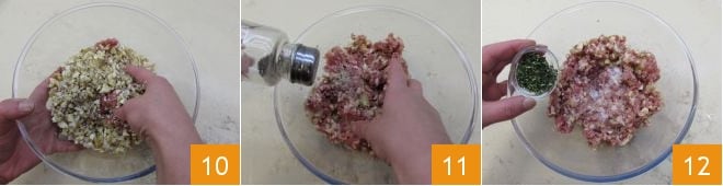Verkneten Sie alles mit den Händen 10 und würzen Sie mit Salz und Pfeffer 11. Hacken Sie den Rosmarin fein und geben Sie ihn zur Masse hinzu 12.