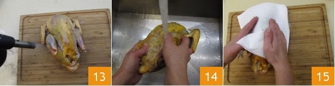 Behalten Sie die Füllung für ein paar Minuten beiseite und kümmern Sie sich um das Perlhuhn. Flämmen Sie das Perlhuhn, um eventuelle Federn oder Daunen zu entfernen 13, wir haben einen Bunsenbrenner benutzt, aber falls Sie keinen haben, können Sie das Perlhuhn für ein paar Sekunden an die Gasflamme halten. Dann spülen Sie es unter fließendem Wasser ab 14 und tupfen es mit Küchenpapier trocken 15.