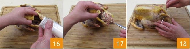 Salzen und pfeffern Sie das Innere des Perlhuhns 16 und füllen Sie es mit der Füllung aus Bratwurst und Kastanien, indem Sie einen Löffel zur Hilfe nehmen 17. Nähen Sie die äußere Öffnung 18 mit einer Küchennadel oder der dicksten Nadel, die Sie haben, und Küchengarn zu. Auf diese Weise verschließen Sie es vollständig und verhindern das Austreten der Füllung beim Kochen.