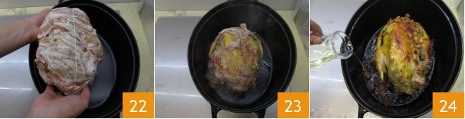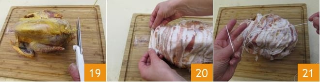 Schneiden Sie dann das Garnende ab 19 und umwickeln Sie das Perlhuhn mit Speck 20. Zum Schluss wickeln Sie alles mit Garn ein 21, als wäre es ein Braten, um den Speck zu fixieren.