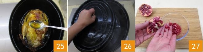 und kochen Sie es weitere 90 Minuten lang, indem Sie es von Zeit zu Zeit mit seinem Saft begießen 25 und alles mit einem Deckel abdecken 26. Wenn das Perlhuhn fast gar ist, bereiten Sie die Begleitsauce zu. Teilen Sie den Granatapfel in zwei Hälften und beginnen Sie, die Samen zu entfernen 27, und legen Sie die Kerne beiseite.