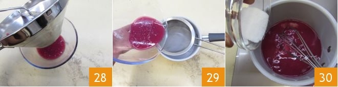 Erhalten Sie 280 g und geben Sie sie in eine Passiermühle, um nur den Saft zu extrahieren 28, dann gießen Sie ihn in einen Topf und filtern ihn 29 und fügen Sie den Zucker hinzu 30. Mischen Sie alles und lassen Sie es 5-6 Minuten kochen.