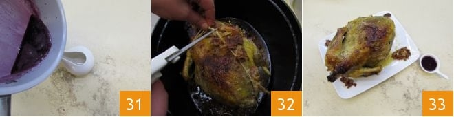 Sobald Sie eine ziemlich dicke Sauce haben, gießen Sie sie in eine Sauciere 31 und nehmen Sie das mittlerweile gar gekochte Perlhuhn wieder auf. Entfernen Sie das äußere Garn, indem Sie es mit einer Schere abschneiden 32, und servieren Sie Ihr Perlhuhn gefüllt mit Kastanien noch warm, begleitet von der Granatapfelsauce 33.