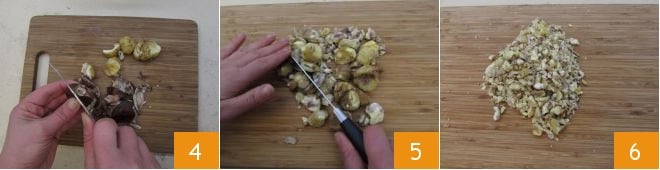 Wenn die Kastanien abgekühlt sind, schälen Sie sie 4. Sie sollten 400 g geschälte Kastanien erhalten, dann hacken Sie sie grob mit einem Messer 5 6.