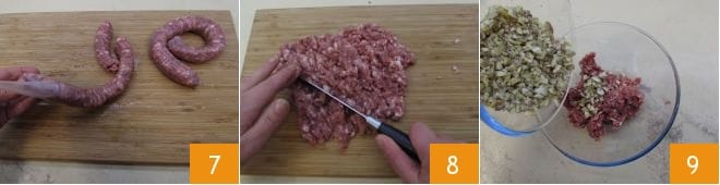 Nehmen Sie nun die Bratwurst und entfernen Sie die äußere Hülle 7. Schneiden Sie dazu einfach die Mitte jeder Bratwurst ein und ziehen Sie die Hülle vorsichtig mit den Händen ab. Hacken Sie auch diese grob 8 und geben Sie sie zusammen mit den Kastanien in eine Schüssel 9.