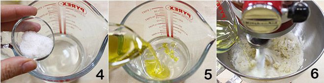 Lösen Sie im restlichen Wasser das Salz 4 auf und fügen Sie das Öl 5 hinzu, gut mischen, dann gießen Sie die erhaltene Flüssigkeit in einem dünnen Strahl in das Mehl, während Sie weiter mischen 6. Kneten Sie alles für 10 Minuten, oder bis Sie einen kompakten Teig erhalten.