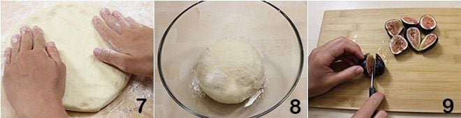 Übertragen Sie jetzt die Mischung auf eine bemehlte Arbeitsfläche und kneten Sie weitere 5 Minuten mit den Händen 7. Wenn Sie einen ausreichend kompakten und elastischen Teig erhalten haben, formen Sie eine Kugel und legen Sie sie in eine bemehlte Schüssel, die mit Frischhaltefolie abgedeckt ist 8. Stellen Sie die Schüssel in den geschlossenen und ausgeschalteten Ofen, wo Sie alles für mindestens 2 Stunden gehen lassen. Nach der notwendigen Zeit waschen Sie die Feigen gut und schneiden Sie sie in Viertel, dabei die Schale beibehalten 9,