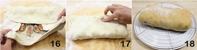 und fahren Sie fort, indem Sie auch die obere und untere Kante falten 16. Drücken Sie mit den Fingern auf die Naht, um alles zu versiegeln 17, dann legen Sie das erhaltene Brot auf ein mit Backpapier ausgelegtes Backblech und backen Sie es bei 200° für 35-40 Minuten. Das mit Speck und Feigen gefüllte Brot ist fertig 18, servieren Sie es in Scheiben geschnitten bei Zimmertemperatur.