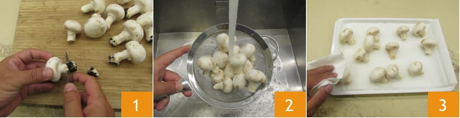 Um die mit Wurst gefüllten Champignons zuzubereiten, reinigen Sie zuerst die Pilze: Schneiden Sie den erdigsten Teil des Stiels ab 1. Wenn sie sehr schmutzig sind, können Sie sie schnell abspülen (achten Sie darauf, dass Pilze leicht Wasser aufnehmen und sich dadurch verschlechtern) 2 und trocknen Sie sie gut, aber vorsichtig mit einem Tuch ab 3, um alle Erdreste zu entfernen.