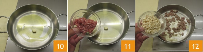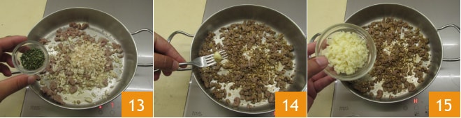 Erhitzen Sie in einer Pfanne etwas Öl mit einer geschälten Knoblauchzehe 10, sobald das Öl heiß ist, fügen Sie die Wurst hinzu 11 und braten Sie sie 3-4 Minuten an, geben Sie dann die Pilzstiele hinzu 12, salzen und pfeffern Sie.