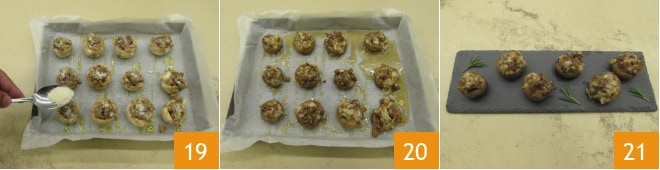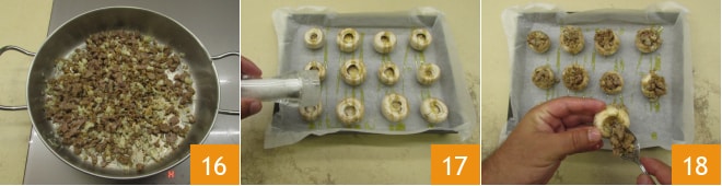 Mischen Sie, um Geschmack zu geben, die Füllung ist bereit 16. Ölen und salzen Sie die Champignon-Köpfe, die zuvor auf einem mit Backpapier ausgelegten Blech platziert wurden 17, und füllen Sie sie mit der Wurst- und Provola-Füllung 18.