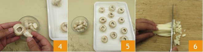 Trennen Sie die Stiele, achten Sie darauf, den Kopf des Pilzes nicht zu brechen oder zu beschädigen 4, und bewahren Sie sie separat auf 5. Hacken Sie den Provola-Käse 6.